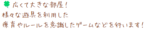 サービス提供時間 | 平 日 児童発達支援/9:30~12:30 14:00~17:00 放課後等デイサービス/14:00~17:00 学校休日 児童発達支援・放課後等デイサービス/9:30~15:30 |